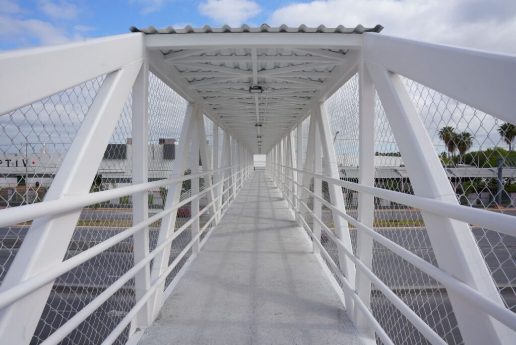 Este puente incluyó la instalación de columnas principales para soporte del piso, armazón metálico para el túnel, postes para elevar la altura de cables, lámina acanalada y losacero, además de pintura de esmalte, barandal metálico, malla de protección, guarniciones, banquetas y sistema de alumbrado.